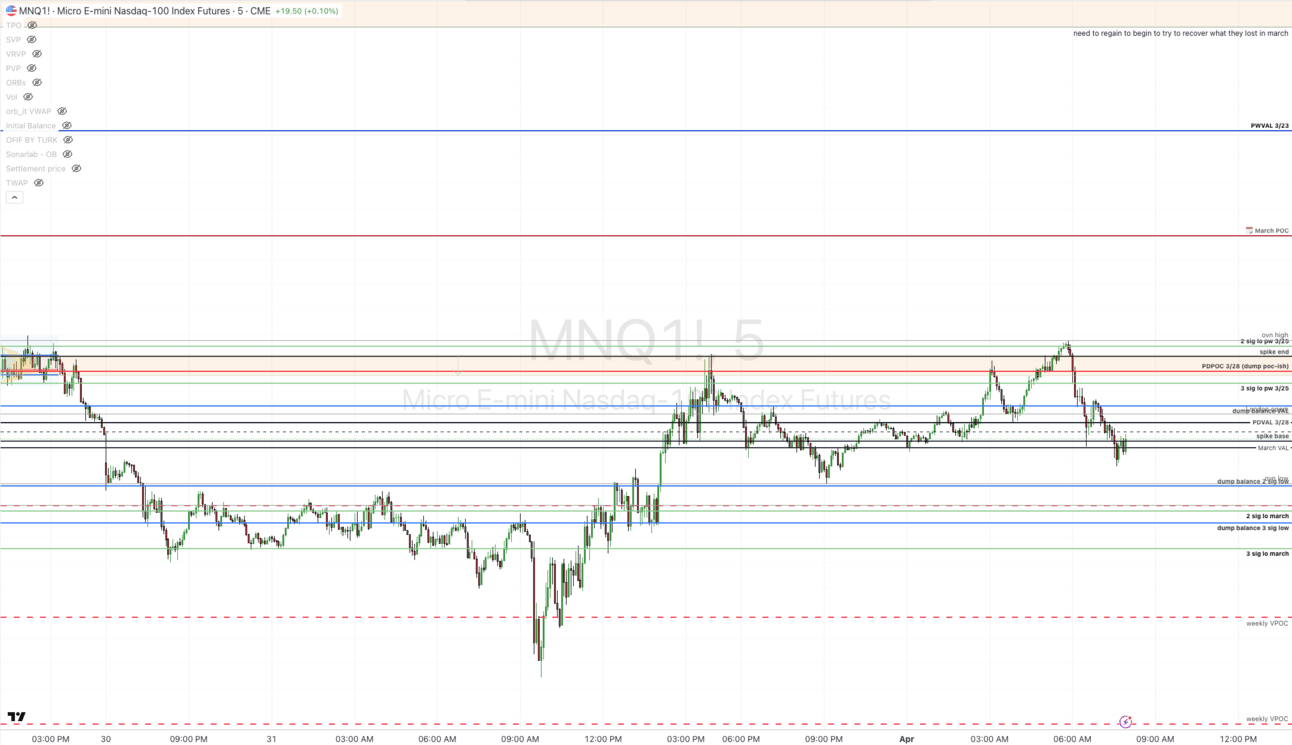 Overnight, she played up and down the spike range, and currently hovering around the low end, so I’m most interested to see if she opens between our 19351.50 and 19485 level. Yesterday, she lost it, then. completely recovered and then some, so if we get another one of those (if you see her recover what she’s lost, for any considerable amount of time), look to the upside, she may be gunning for March POC (but pay attention to the halfway point between around the end of the spike and that level.