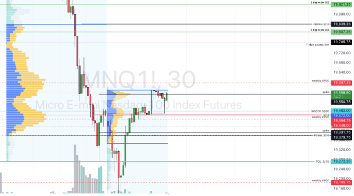 She bought through overnight, including London open,, trying to push through the end of yesterday's spike and failed, then bounced up again from London open, which is a few ticks (~10) from yesterday's settlement. So premarket is (mildly) bullish, on the face as of this writing She'll have to get through all the way to PDVAH to be truly bullish. And if she makes it there, congratulations, for sure, they want a Turnaround Tuesday!