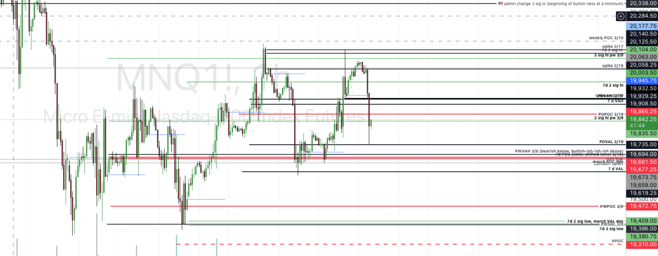 Weāve had relatively low volume this week, and the marketās been all over the place. Itās been just us bottom feeders it seems⦠Yesterdays rejection at 3/17ās afternoon spike was a chefās kiss if you took it. I wasnāt active at the time they hit it, and I would not have had it right at that spike level, but most certainly at last weekās 3 sig hi (99% percentile of volume traded last week), and set my stop above that spike (even better above last rejection level)ā¦the r/r was a no brainer. They tried to recover before the bell, and they closed above 7d VAH, which was a decently bullish closeā¦it means they had no intention of losing this upper area of the balance.