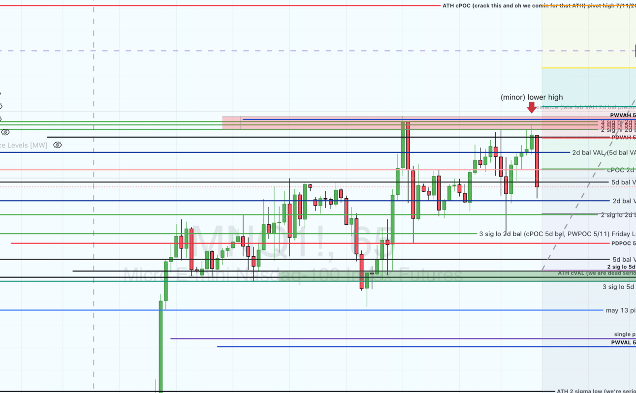Overall, we are still bullish. That dump was a big candle, but we went practically nowhere. I wanted to post before the open because I’d rather watch with curiosity than make a prediction…will she gap down even further? even below our green area to revisit numbers below? If so, I’d be incredibly careful hoping for a shorter term recovery, unless previous week value area low holds. Will she gap above the red zone, faking everyone out? Seems unlikely based on what “everyone” is saying, but anything can happen, and we can be ready for what that means.
