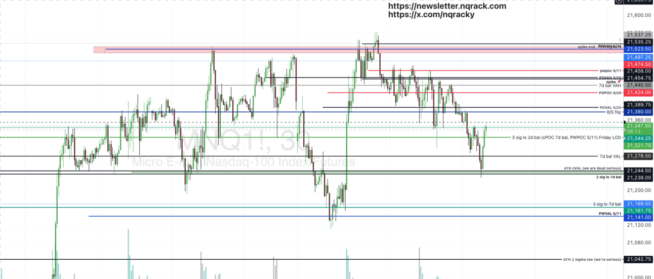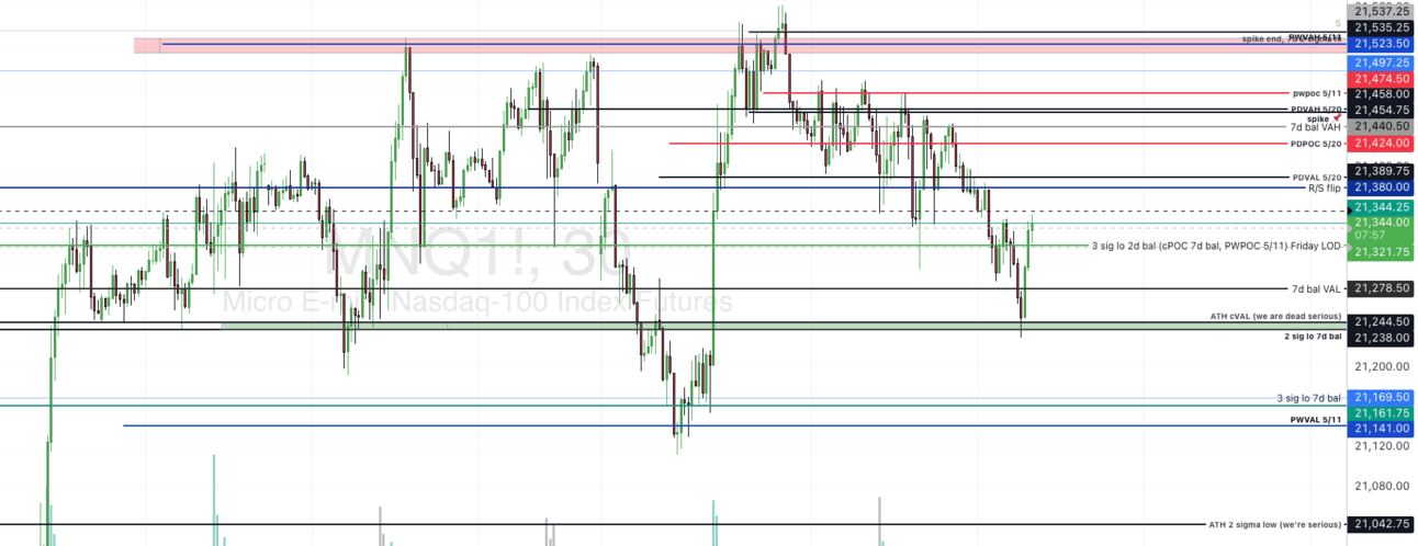 Yesterday was a bonafide sleeper, which left them to drive downward through the larger balance overnight, defending the “dead serious” territory this morning with a decent tweezer bottom around the 2 sigma low of our 7 day balance. She’s currently below it, and, unless the bulls are dead lazy today, they’ll at least try to enter yesterday’s (miniscule) value area, for a rip through it. If they strongly reject it in premarket again as of this writing, I’m keeping my eye open for lower numbers. What would not be surprising is a trip. up, a reject, then some hovering before the open in an attempt to reclaim that area.