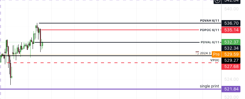 She’s at the edge of yesterday’s value area low on close, but below it now…may need to stay there until open to fill the gap. So far looking like a bullish day with possible continuation to 527, at least.