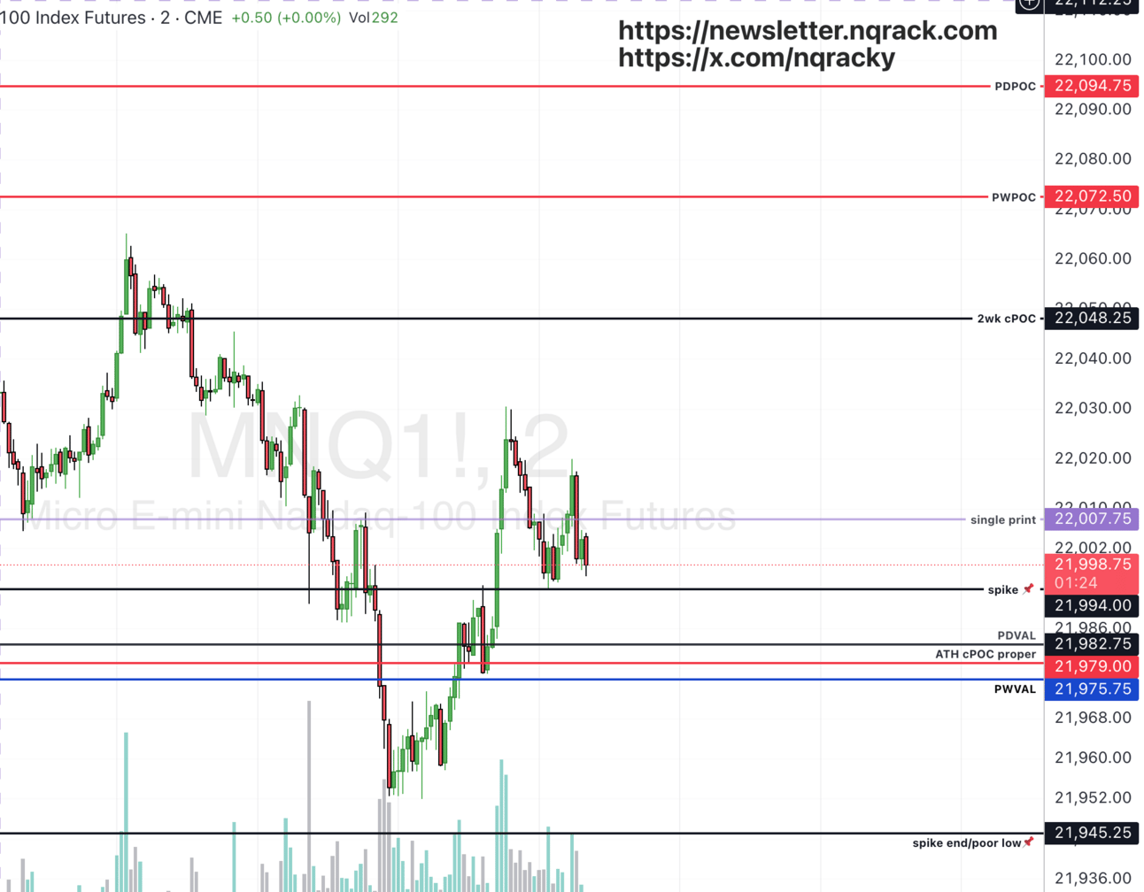 Bullcase Bulls need 22145 to start being bullish. they’ll need to get through 22048.25 and 22072.5, and 22094.75 first. then we’ll see continue 22168.5 (it’s magnetic, and resistance). Then, 22183 will need to be conquered for us to have hopes for a red candle on the week. | Bearcase Currently bulls aren’t in trouble, we’re in no-man’s land, but a loss of 21892.75 during or at session means 21975.75 is on the table. We have a poor low that would appear wants attention, at 21949.29, and if we break that, 21915.5 is back. we spiked this for a strong reversal yesterday, so i would expect support at 21949.25 and 21915.5 zone, but anything can happen. If they want it they may consolidate & dump, or cut like a knife through butter, but it’s a potential drama area.. |