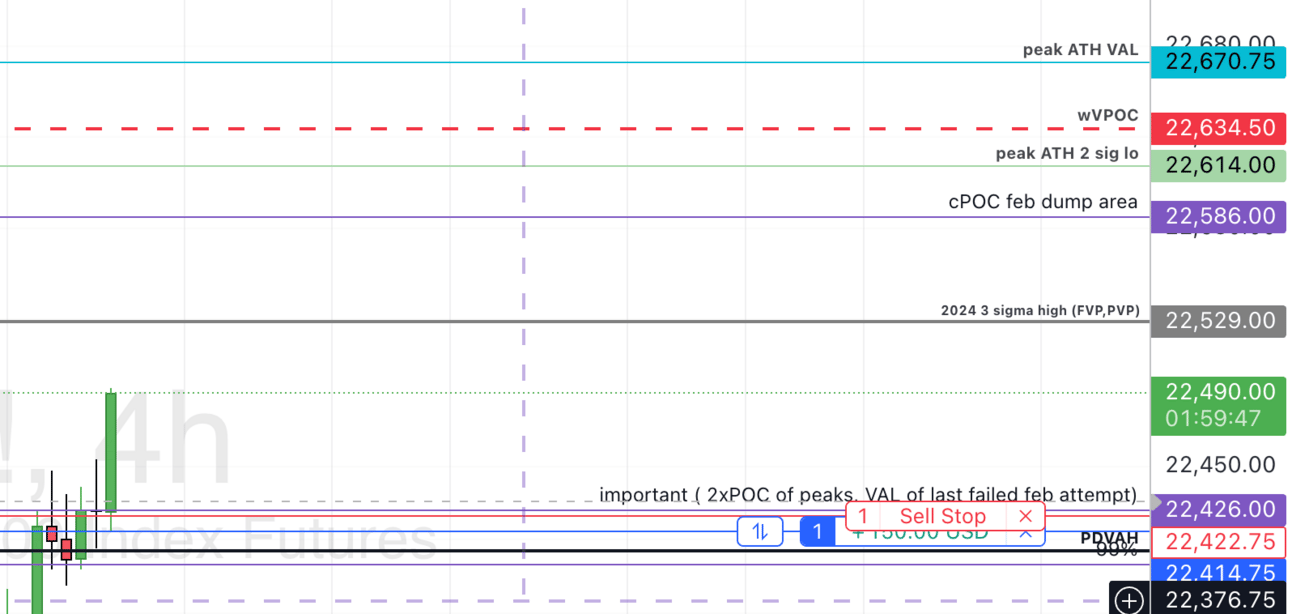 Above staying where she is, above 22043, 22529 is the target, and some overhead resistance if hit during the session. 22586 is next on the table, 22634.5 is magnetic. | Below losing 22403 is bearish for the day, but will have to get through 22426 first. below that, 22308 is a target, and bounce place, depending on how she’d get there. |