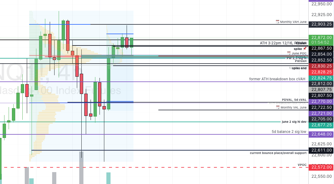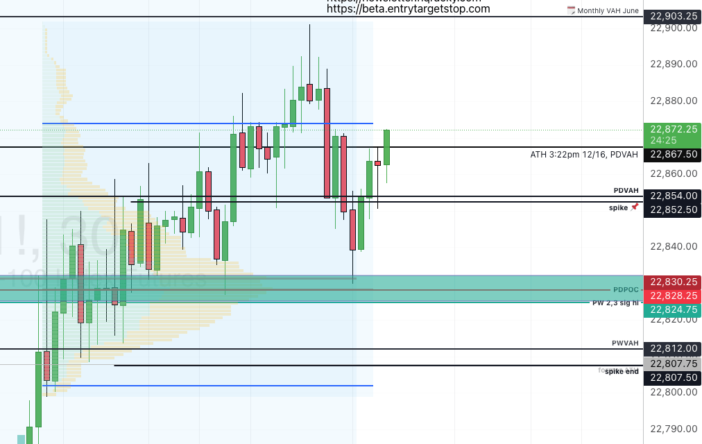 Above Staying above 22854 is bullish and puts us back to retest 22867.5, our (now) former ATH. above that is anyone’s guess, but here are some numbers to look for: 23052 yw! :) | Below Falling below 22854 on the day keeps us within our current balance area, with a retest on the table of 22828.25, 22824, and potentially, 22812 |