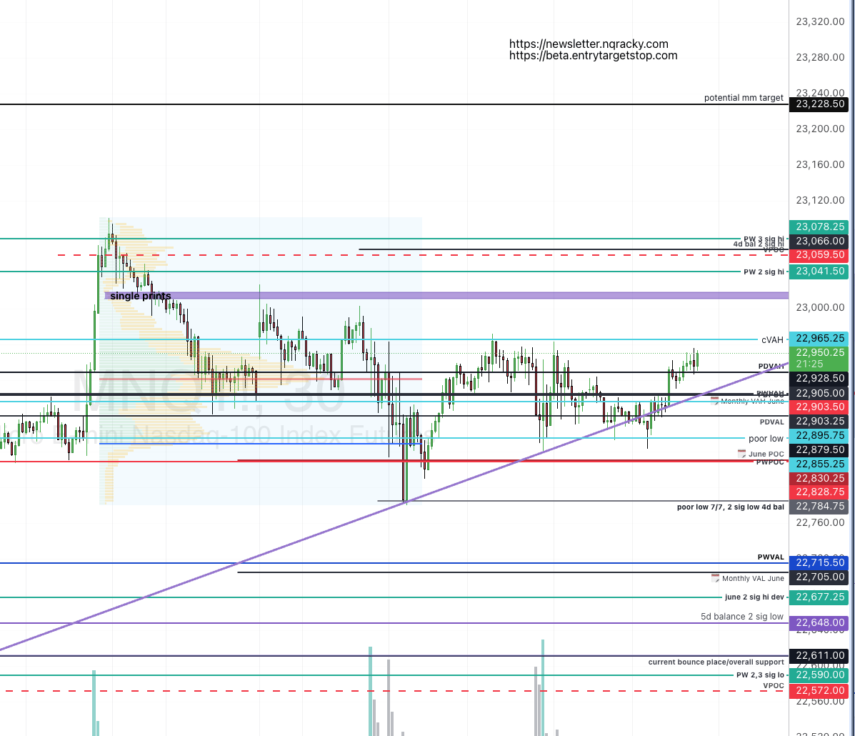 Above 22905 is the number they’re trying to stay above,to signal bullishness on the week, so i expect some defense there, if not 22879. So far they haven’t done too well, but if they can, 22965.25 during market session will need to be captured, and they want to try to beat that zone starting at 23011. if they can take that out, then 23059 becomes magnetic, and beyond… | Below if they drop it below 22895.75 (good for a long scalp), it opens the door to revisit 22850, via 22868.25. losing this and it’s 22828.75, and a retest of the poor low set at 22784.75. I would expect a bounce or spike at 22784.75 if they don’t aggressively lose it, we’ll see how long it holds. if they can’t, 22715.5 and below is on the table. |