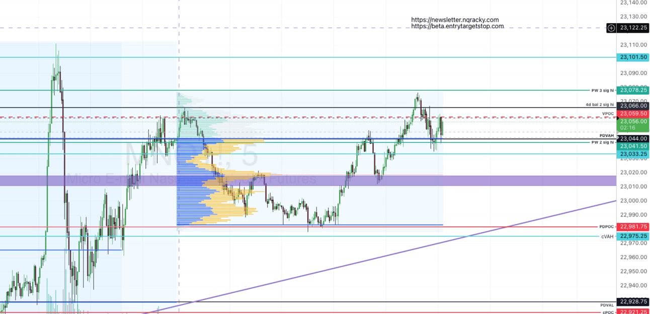 Still creeping upward, but near the top they’re still tricky, especially premarket. the bias is to the upside, given they’re above previous day’s value area as of this writing. Lose that however and today could take us down to 22981.75, easily (given it’s the bottom of today’s developing range, as well). Zooming in a bit more than usual, given the…”urgency” of these moves right now. They seem to be being surgical about how to approach this rally; 23020-23010 would probably have been the safest long (and still may provide an opportunity if they pull back there)