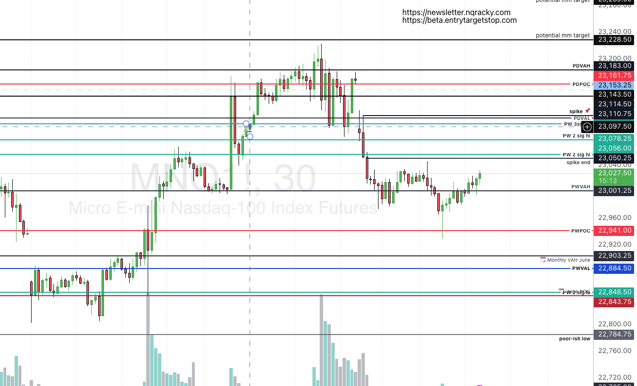 Above | Below losing 23001 opens us up to hit our overnight low, which is below our 22941.00 potential bounce place. losing that, she’s seeing 22903.25. losing 22884.5 is trouble for the bulls. |