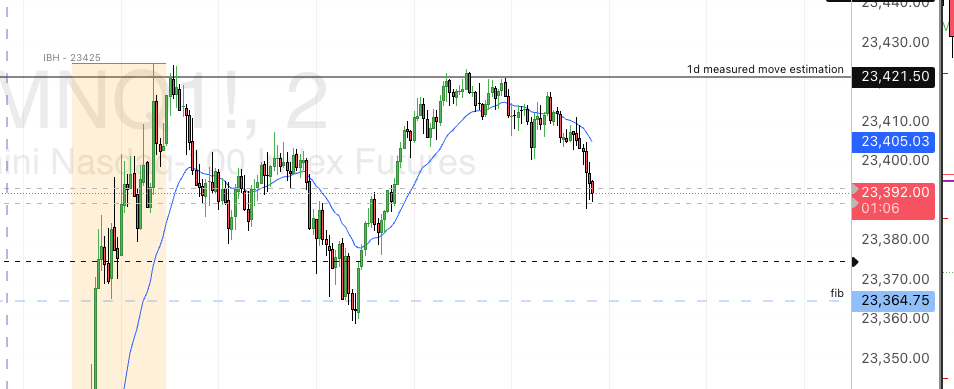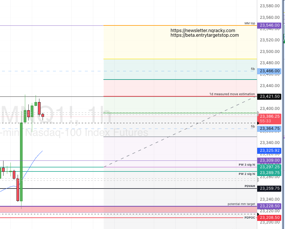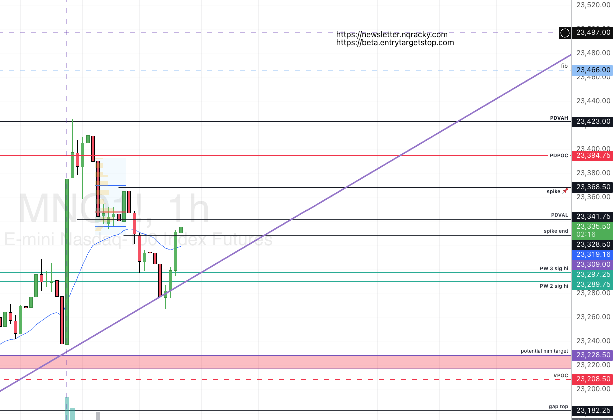 Above 23328.5 wants to hold, and getting into 23341.75 at the open would be ideal. clearing 23368.5 (likely if we can beat the prior number) is the inevitable 23394.75. if they can push past, the next in the sequence i have is 23423 → 23466 → 23546 as my last number at the moment. | Below Staying below 23341.75 will drop us for another attempt at 23297 and 23289.75. there’s a pretty big drop below if they can make it down there, to 23228.5 for a retest of yesterday’s springboard. losing that and we have a magnetic number at 23208.5, and a gap top danger zone at 23182.25. Anything else will need to be tweeted out. |