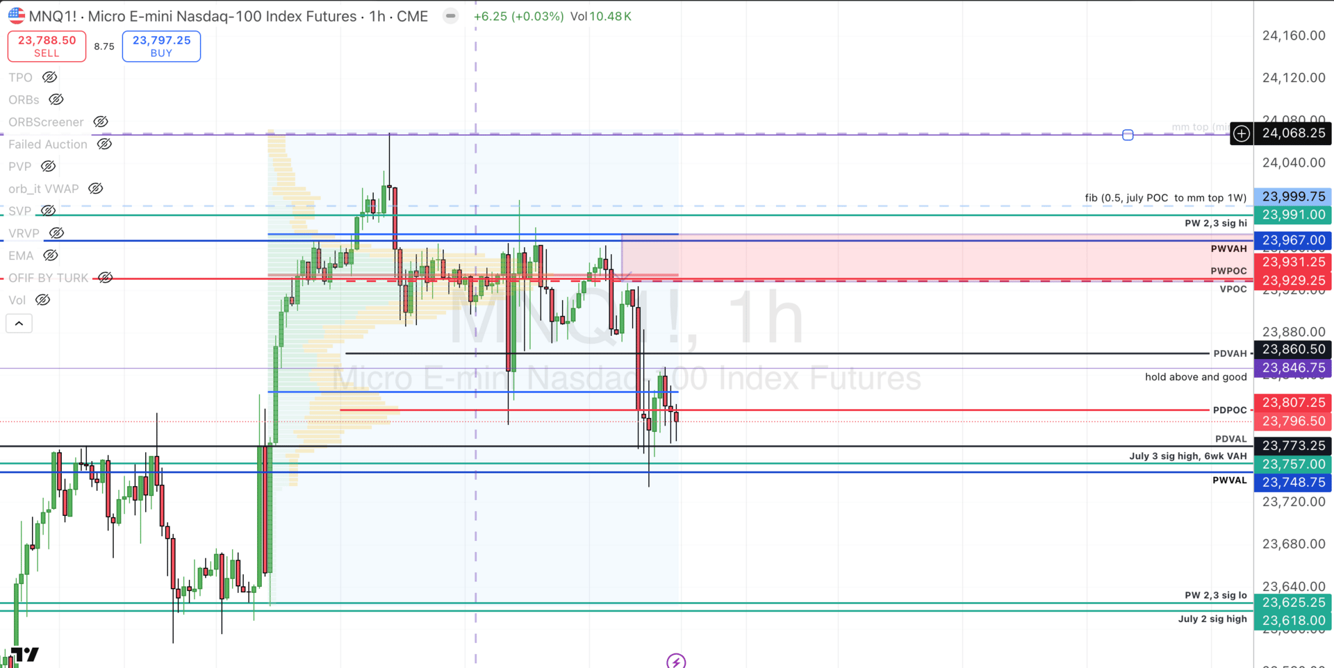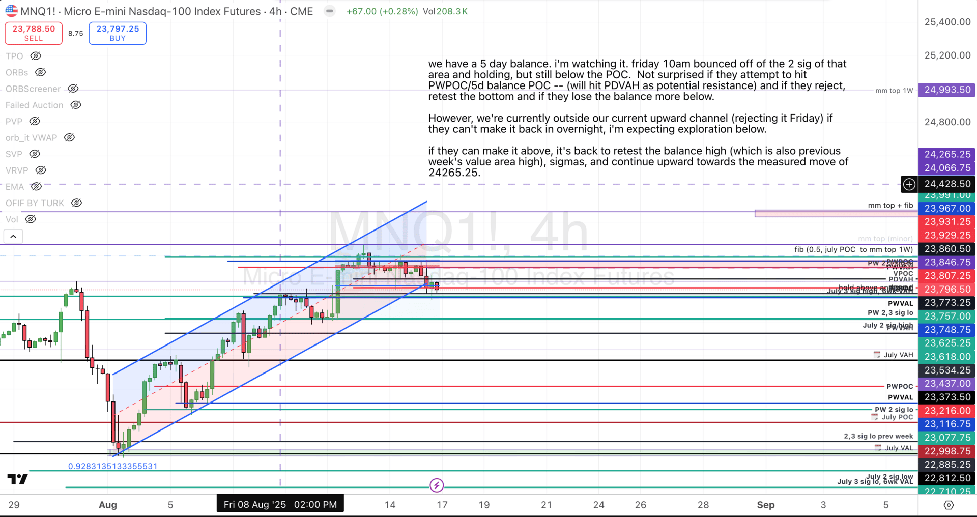if they can make it back into the channel (specifically hold above PDVAH @ 23860.50), it's back to retest the balance high (which is also previous week's value area high), sigmas, and continue upward towards the measured move of 24265.25.