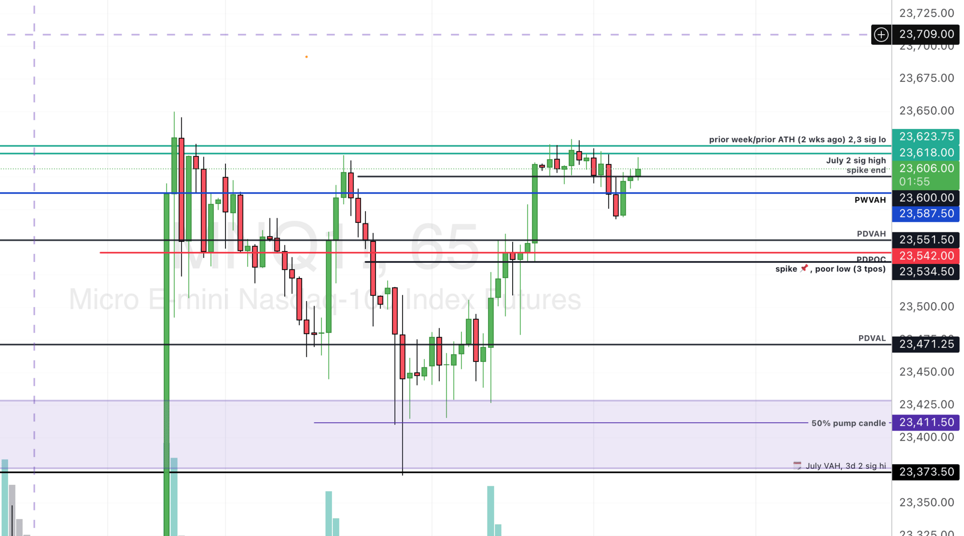 They haven’t cracked it again yet, but they are still hanging around the highs, were above yesterday's spike (update, they dropped, by the time of this publishing, but trying to recover PDVAH) That, on its face is bullish, until its not. lose the spike, hang out there below longer, and we can see a visit back to our spike end, which corresponds to a poor low made yesterday. Poor lows are often revisited, and today may not be its time, but we'll be keeping an eye on it. There is a lot of room between Friday’s high (our recent high), and the value area low of our all time high area, so we might need to consolidate a little more in this area, so I wouldn’t be surprise if we dip again today. But given we’re still hovering at the highs, I know overall she wants higher, so I wouldn’t be surprised if we try to rocket today, tomorrow, or even for a repeat on Friday.