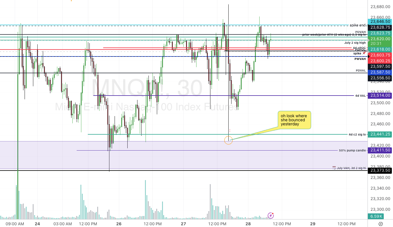 Above above 23628.75 is bullish for the day, giving us room to play in the prior all time high value area. itβs on to 23646.5, and beyond. | Below lose 23597.5 without a speedy recovery (5 mins or so) and weβll retest 23587.5, and if we canβt hold it, on to 23556.5. May God be with us if we canβt hold 23514 again. |