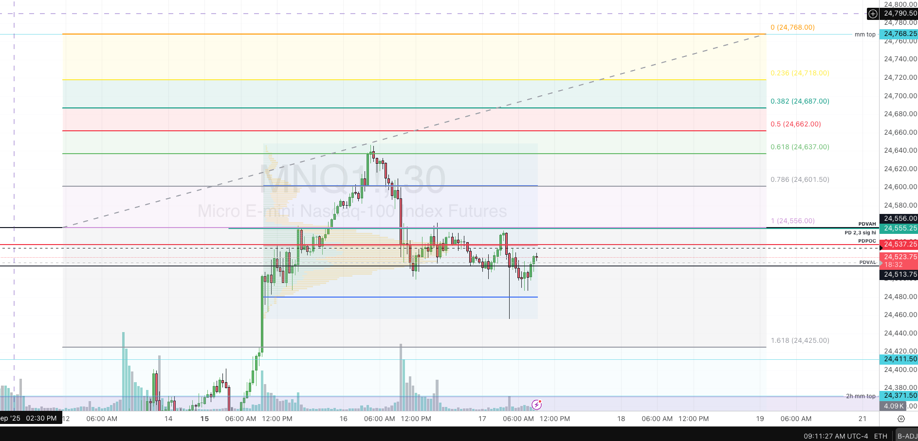 if we can stay where we are, within yesterday’s value area, there might be a push higher. I don’t expect them to try to go too much higher than our yesterday’s value area high before the fed meeting, but anything can happen. Right now they’re hovering near yesterday’s lows so keep an eye out. london open was a decisive wick at 24455.5, so that’s clearly an important place, or a signal. They’re either wanting to make sure they’re in for a move up? or ready to sell what they were able to buy up in the morning. we will see.