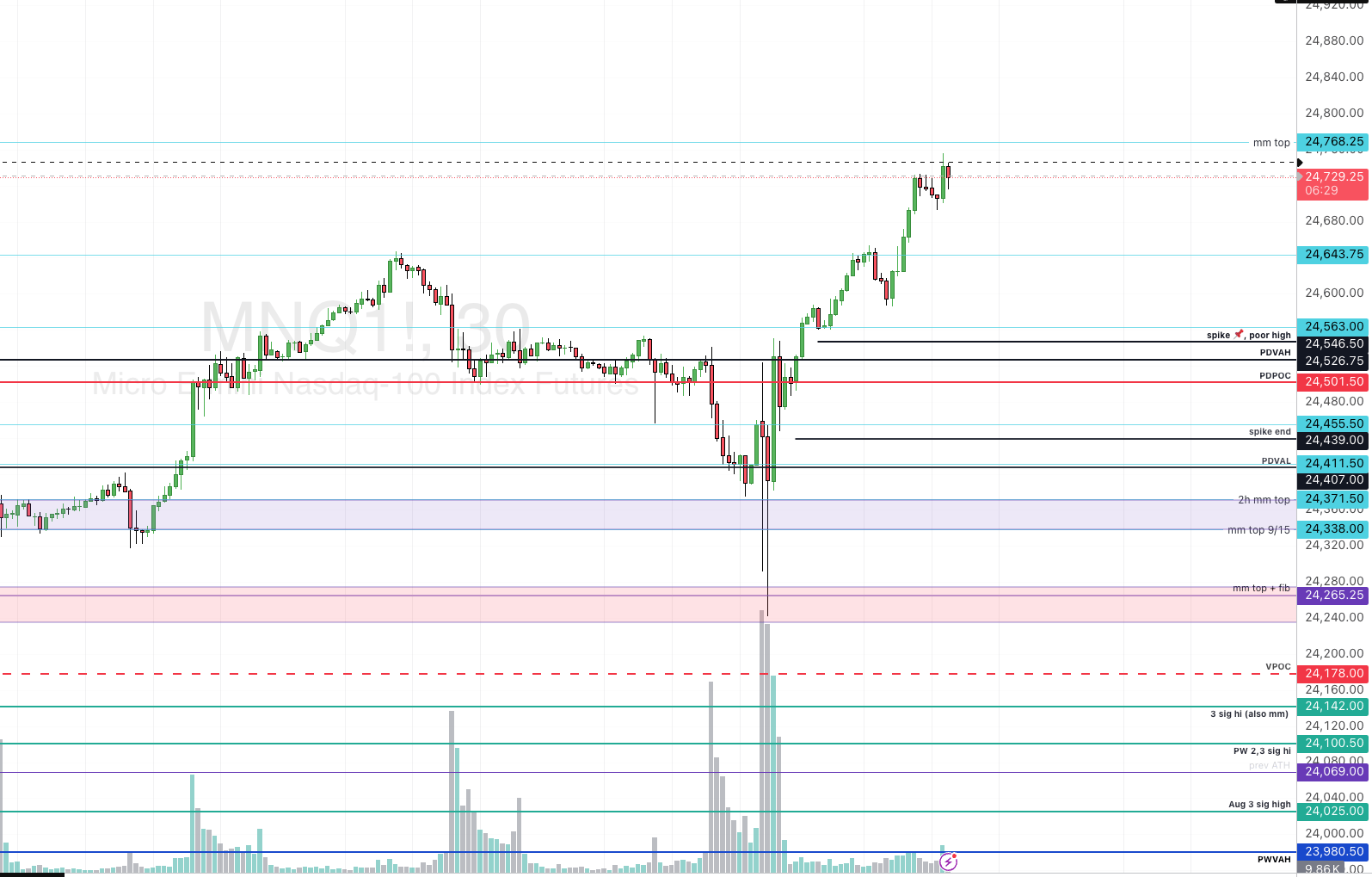 overnight, they’ve completly rocketed from any lower zones, well extended above yesterday's range, presumably headed towards our measured move high (as of this writing they’ve come within pennies) with no signs of stopping. There is a weekly measured move high nearly 200 points above the current MM target (24768.25), and i don't doubt they could get there today. They are up over 1% already; it's been a while since we've had such a strong day, i'm here for it.