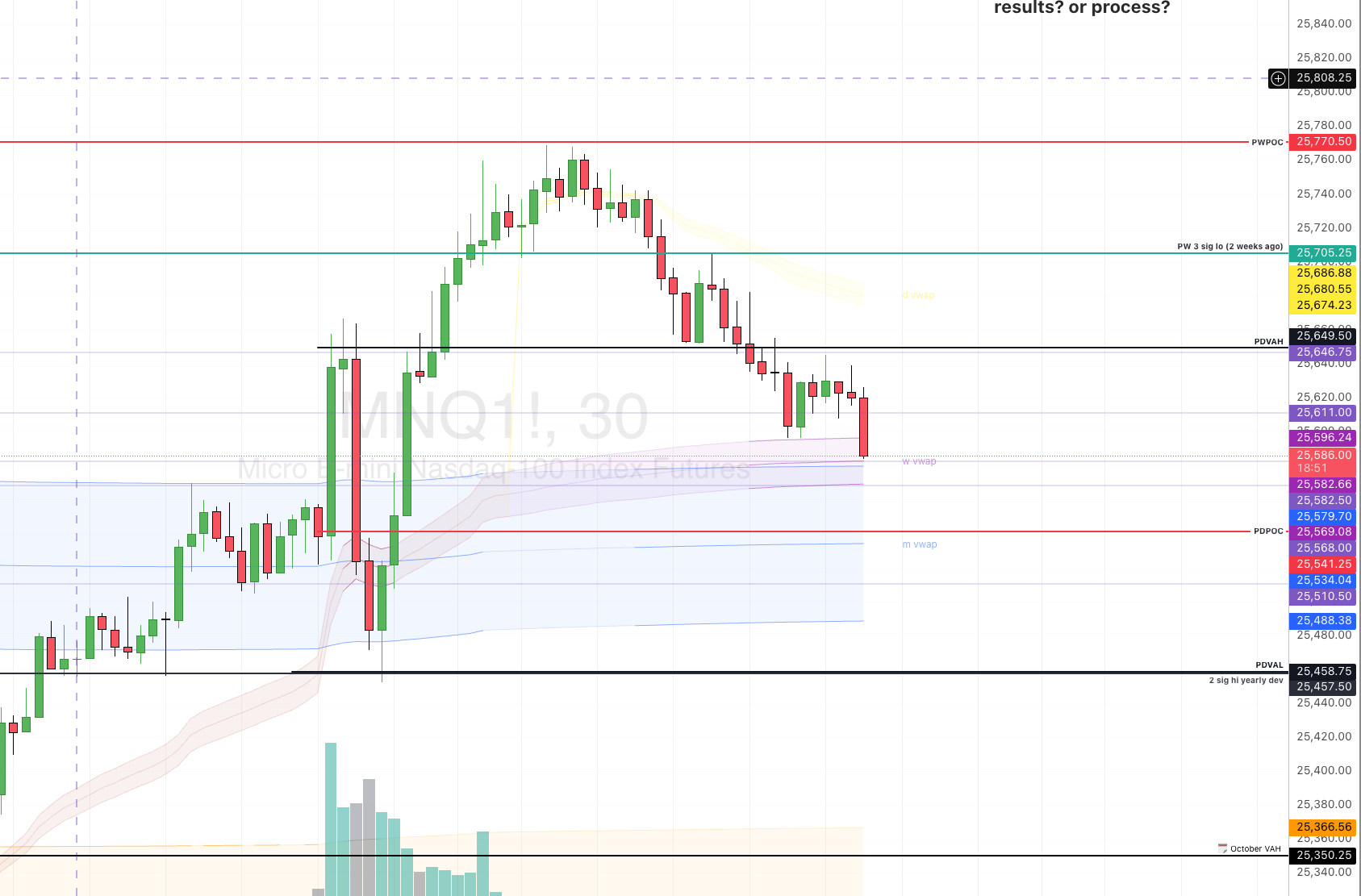 Above above 25649 and they can continue the bull ish…they’ll need to reconquer 25705.25. It’d be great if bulls could actually get over 25770.5, because that means they’ll have a chance to reach 25886.25 and above. | Below holding below 25649 is taking them to 25541.25…holding this before market close and you may wanna watch out if you’re short…otherwise, traveling to revisit that area that was holding all night last night: 25458/25457. lose it? we’ll get our 25350.25 again. |