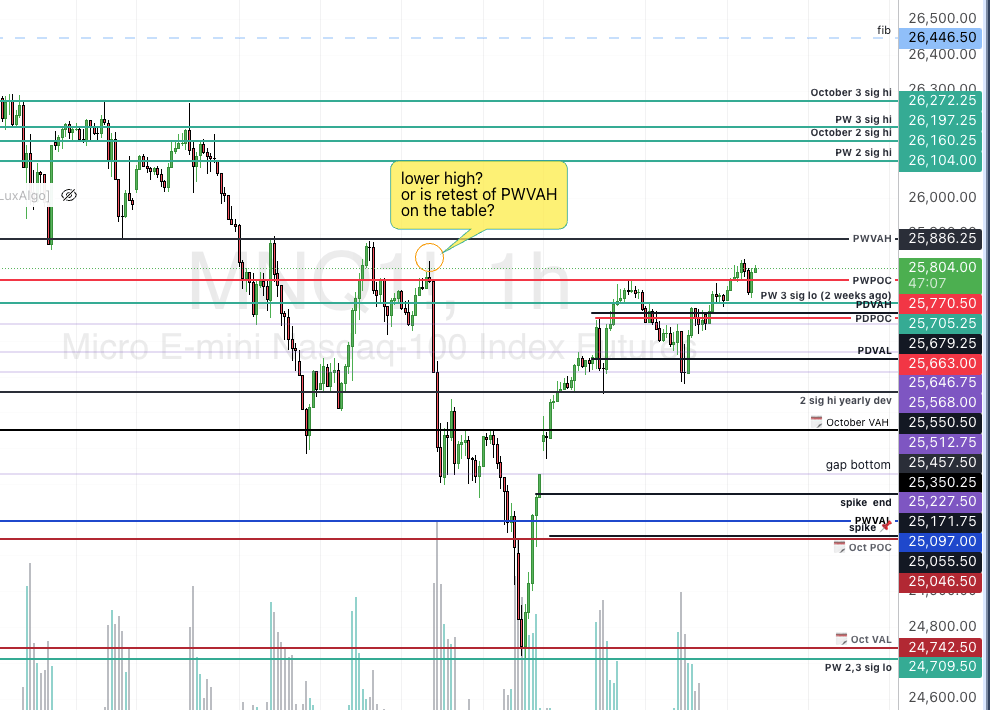 So, she turned around for a tad yesterday, only to recover and then some for the day, gap up overnight, and trying to follow through. Last time she was here was Thursday. She’s hanging out near that number that could potentially be a lower low if she can’t take it out by the open, but she’s so dang close to PWVAH that it’s worth giving it a go. I’ve seen her dump from here, and I’ve seen ‘em make a go of it from here. If we find ourselves there again, third time might be the charm for continuation.