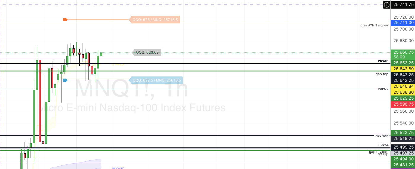 very ugly flag up, waffling around the previous day’s highs with the intention of further upside. As long as she remains, 25711 is the next bit garget along the way, as this will get us into the very edge of the previous all time high value area (and, right around QQQ’s round number 625). So far she looks like that’s what she wants today. The news might move it forward it at 10am, or have them proceed to dump. But currently, it still seems to be a “buy the dip” situation.