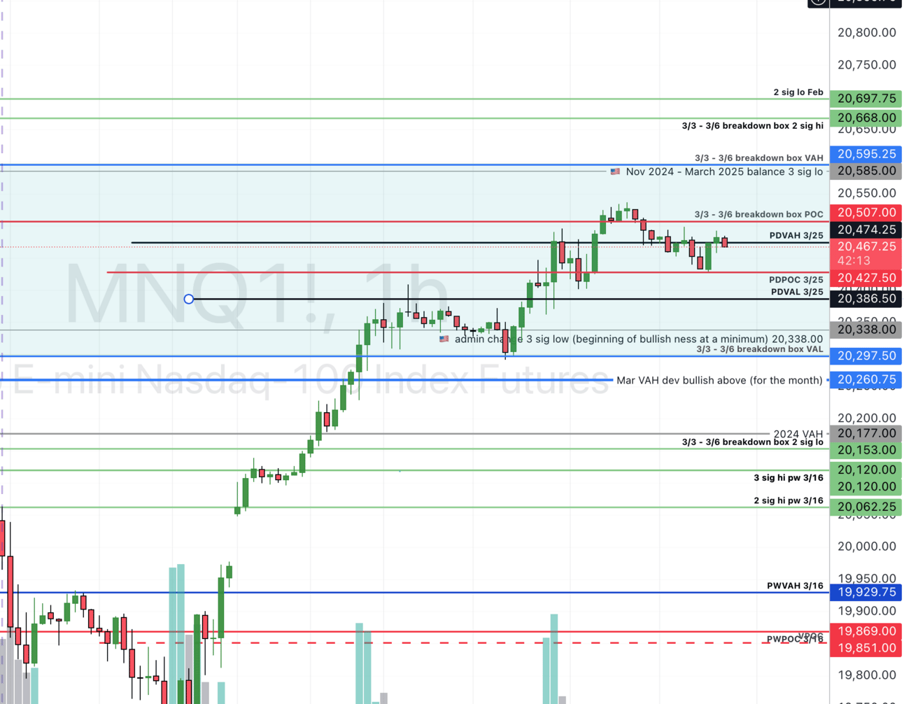Af far as I’m concerned, we are locally bullish, try to work our way up this breakdown area to be overall bullish again. As of this writing, we rejected the breakdown POC but are moving up towards it again, negotiating yesterday’s VAH before 8:30 news. I would expect us to test the top of the box (which happens to coincide with an updated number for the Nov-March balance box sigma level), for an initial rejection, but it may not last long; they could blow through it. We will see!