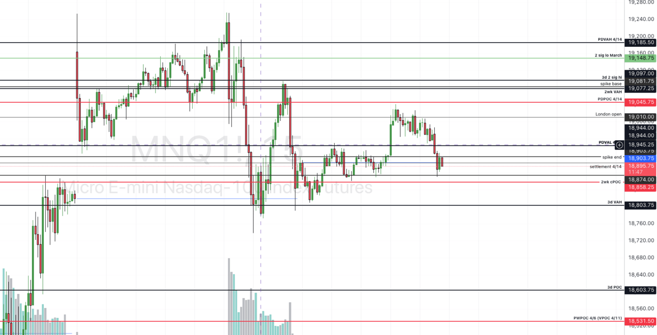 staying below PDVAL @ 18944 and losing yesterday’s spike end @ 18917.5, gives us a down day, revisiting 18803.75 (multi-day VAH). Bears would love to continue to close candles below, as lets them be able to work on tapping 18603.75, the magnetic 18531, and 18318.25 below. There’s a lot more room to fall down than up this morning as far as key levels, so this may be a nothing tape (price action was downright aesthetically ugly last evening) or we could see a nice chunky move.