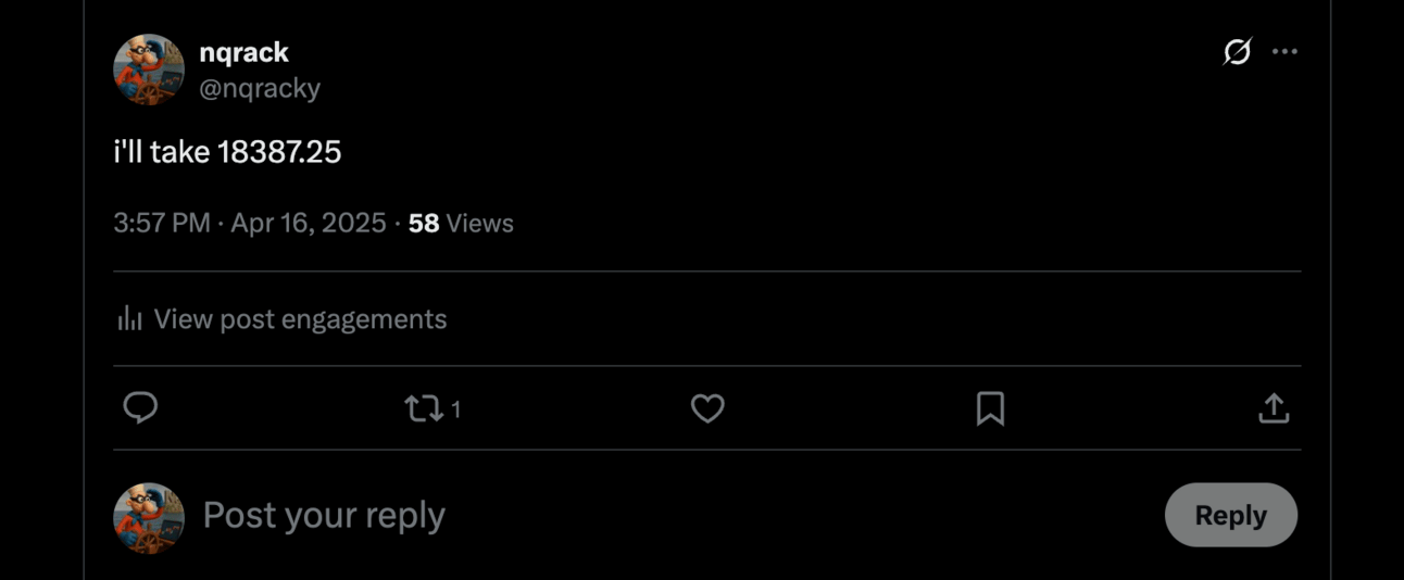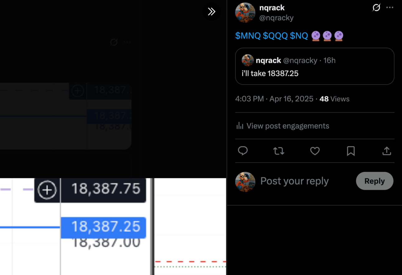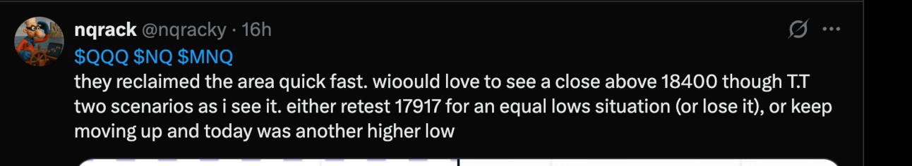 Shout out to the market for closing right at my number yesterday. on $MNQ_F ( 0.0% ) LOL. Before the close, i was looking for a number, and in my first tweet, was too lazy to look at the exact. number so called it 18400…