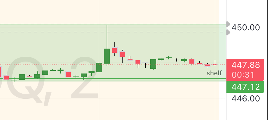 While i’m on the subject of $QQQ ( ▼ 0.32% ) , if it’s helpful, i’ve marked a long-time zone. recover it and she’s definitely seeking higher. right now she’s just kinda playing around inside of it, after yesterday afternoon’s recovery.