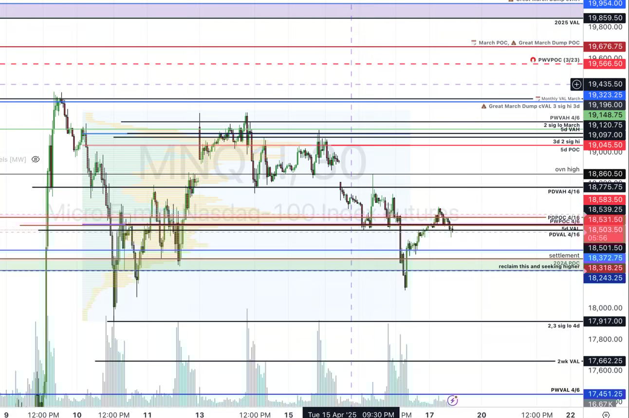 staying above 18501 (or recovering it during the session if she loses it before I send this) is bullish-ish for the day, seeking back up to 18583.5. they got a bit of work to do to reclaim 18775.75, which, if they close candles above during the session, finally bullish (without the ish) for the day. if they get past 19045.5, then, good job bears you stayed awake.