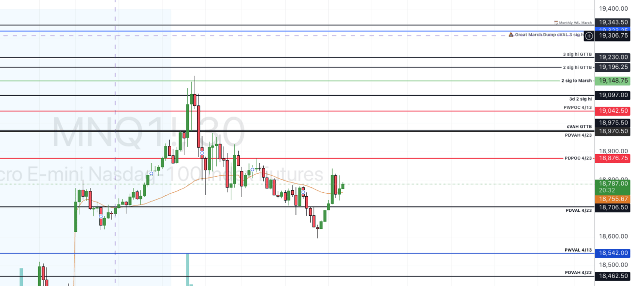 staying above 18706.5, and she’s gunning for 18876.75, 18970.5. if she can close candles above 18970.5, she’s bullish for the day, and looking to retest 19042, what she lost at 19097, 19148.75, and several ranges above. If the market wants wants to rip faces, 19566.5 is on the table.