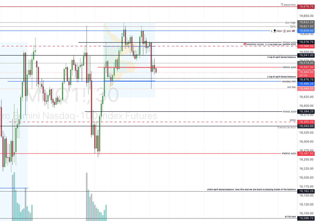 currently after tapping the PWPOC here and there, they’ve dumped, and are grinding down, towards monday’s value area high, seemingly to see whether not it’s still worth anything to the bears. I’ve marked an upper balance area, which, if ultimately lost, keeps a larger balance in play, giving us a solid Turnaround Tuesday.