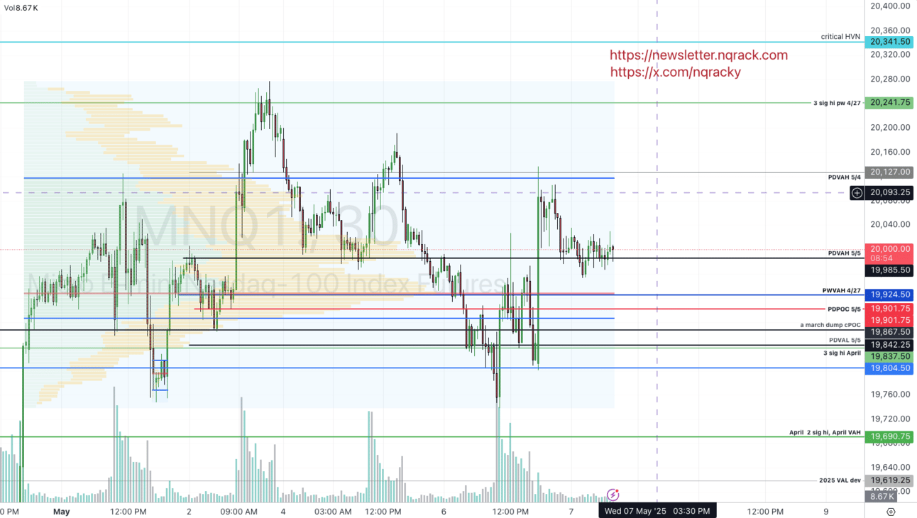 $MNQ_F futures opened and rocketed last evening from...the 2min value area high of the consolidation area created around the same time last Thursday, May 1st open. i remember this area; i took a nice long from it, and missed another in another account. There are no coincidences