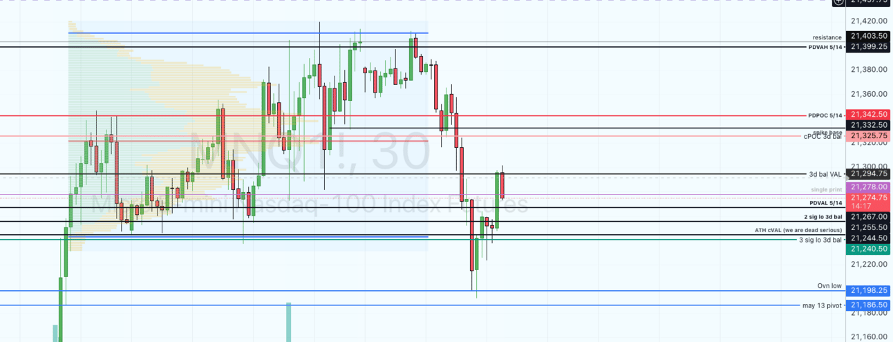 And yes, she dilly dallied yesterday. popped above for a second (and gave me a bad trade, not gonna lie), then right back into the area to dilly dally in the balance. We took an overnight dump, but began to turn around, making a higher low from Tuesdayâs 5/13 weâll call it a âpivotâ, and then recovering the 3 sigma low of a 3 day balance: