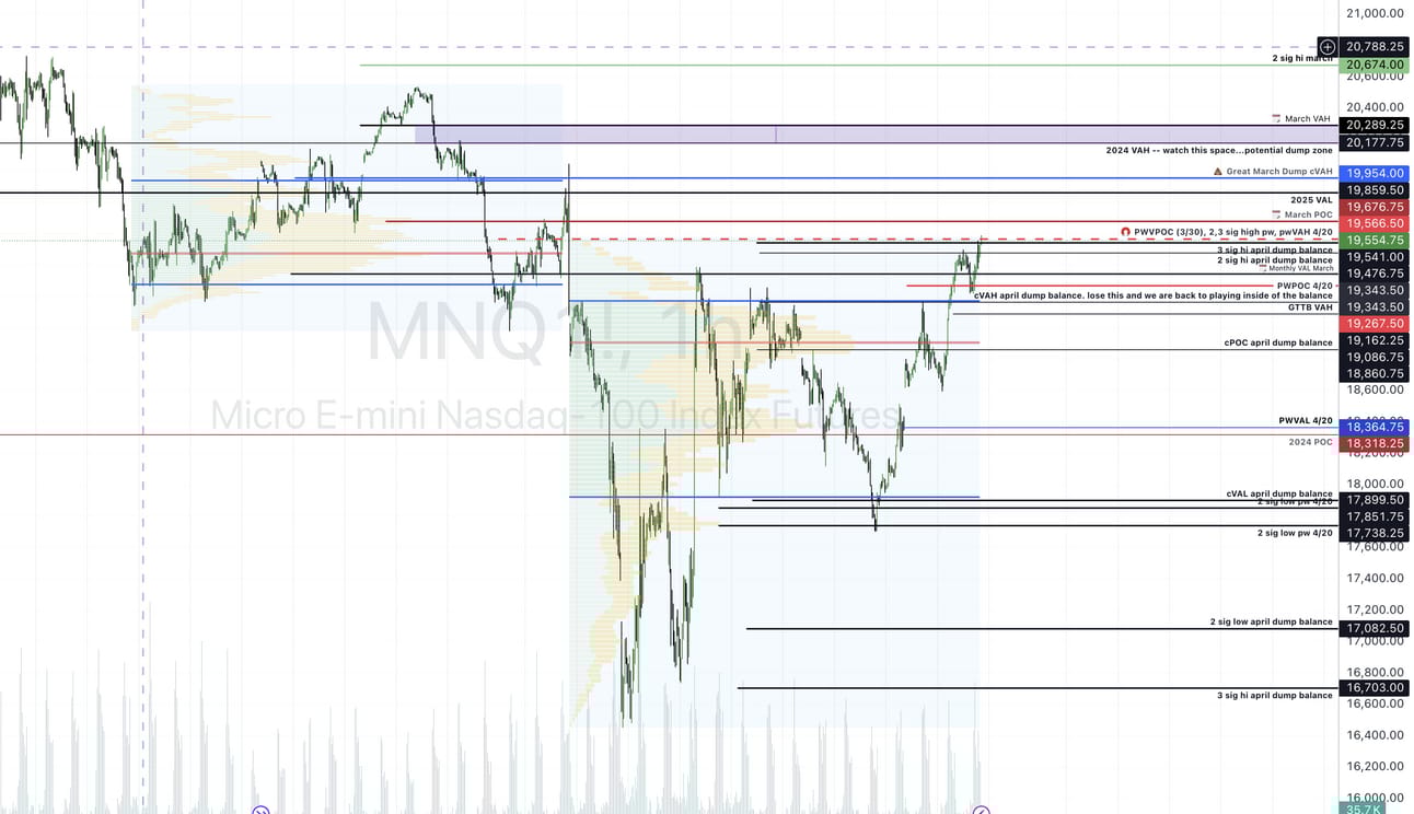 Given the current momentum, headed to test 19676.75 if she can make it there, and crack it, itās opening the door to 19859.5, a critical milesotne, as itās the value area low of 2025, and opens the door to 19954. 19954 will finally get us back to what we lost on that fateful day in March, and, in my view out of correction territory. A bull can dream about 20289.25, right?