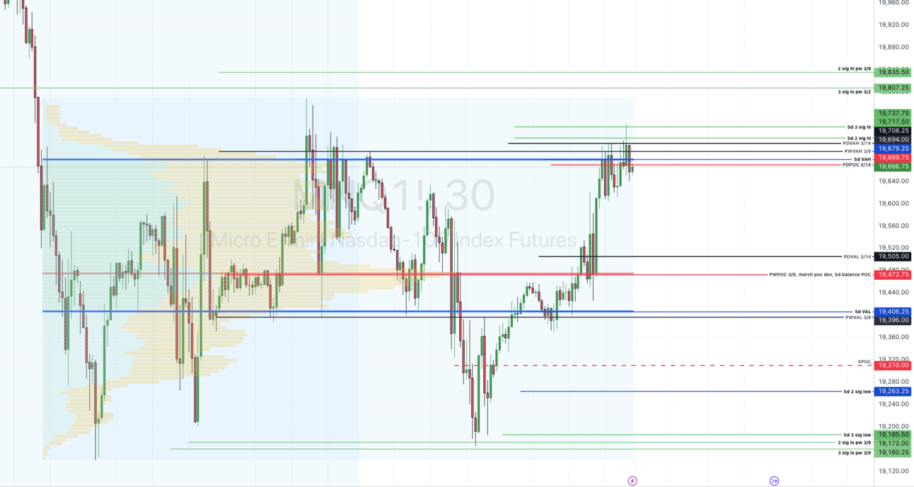 If you read Friday’s email, i mentioned the rough waters above, and it’s certainly been a problem. there are a lot of levels to work through in order to even begin to recover what we lost about two weeks ago. One way I can see them getting over it is a gap up at open (update: that didn’t happen), or a quick rout up during the open, however, given we’ve been in a 5 day range, high probability that we begin to seek below, if we can’t get moving quickly above this sticky area. Below the range is still, especially in this correction season, quite a bit of unfinished business to test below, including the still untapped 2024 VAL, 2024 VAL and 2-3 standard deviation below. If she loses PD value area low, we’re on our way to the bottom of the range, and (hopefully for my personal sanity) finally tapping 2024 POC (because i’m tired of talking about it 😂 )