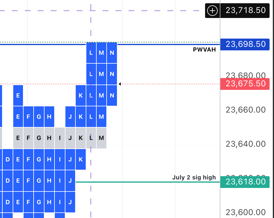 PWVAH is at a poor high. Interesting. if we trade lower overnight, iām looking for them to try to clean that up at the open, unless theyāre dropping below last weekās lows, but otherwise, as long as theyāre still hovering within last weekās value area, iām looking for bounces to travel upwards to try to clean up this poor high. Note that itās possible for them to just gap above all that and continue highter for the week.