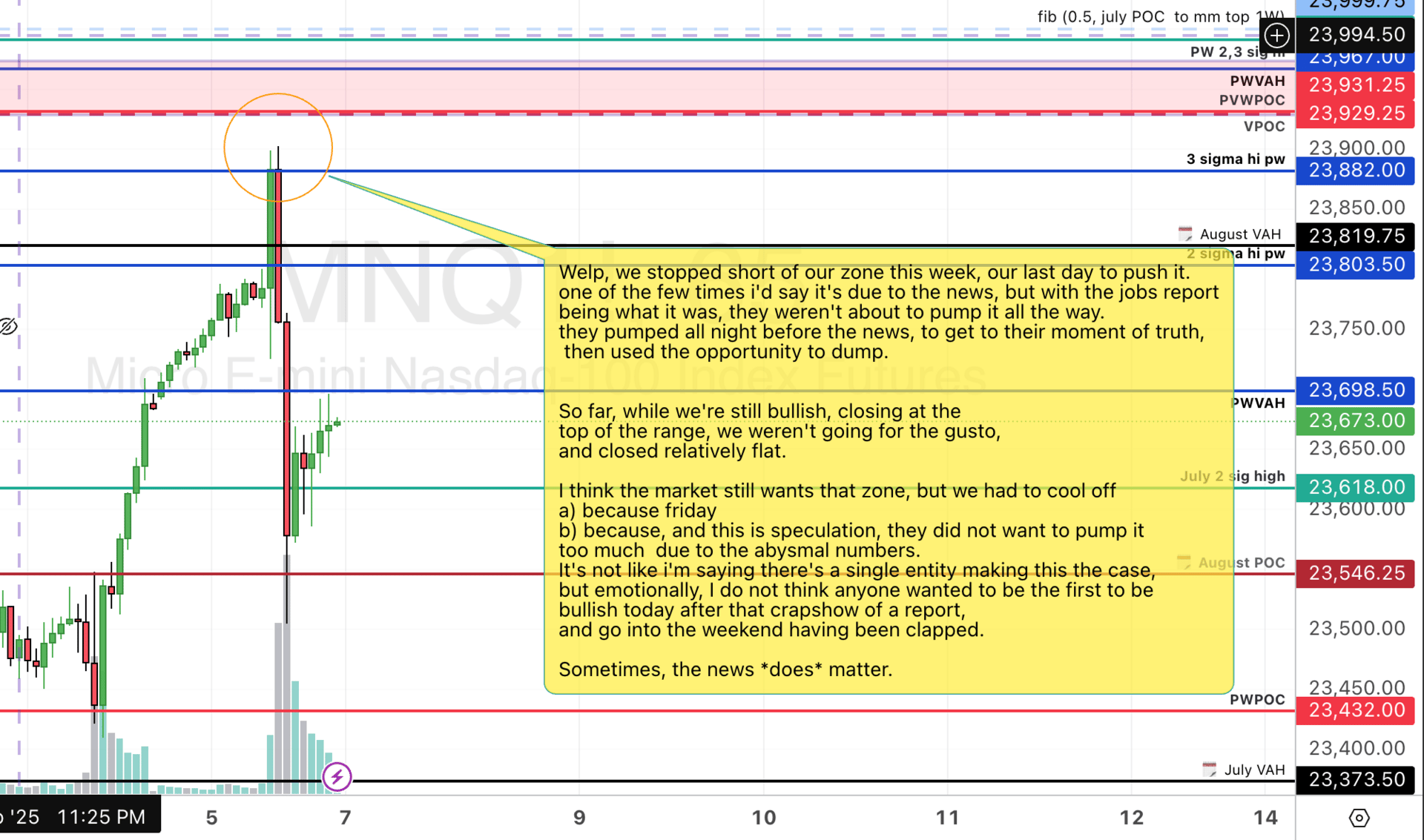 Friday would have been the chance they had to push the price up to our VPOC numbersā¦which are normally magnetic, especially with a Previous weekly VPOC being on the horizon, and the fact they finally waited ātil the end of the week to push it, breaking the high of last weekās value area.The fact that it stopped short while so close was interesting to me. This really makes this one of the few times i'd say it's due to the news, given they had a chance to push it there (and beyond), but upon the news made a retreat.